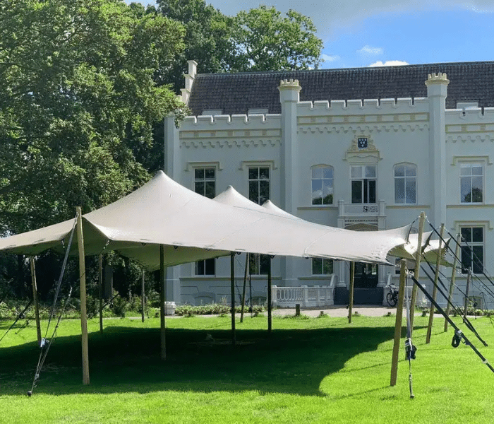 Onze 17,5 × 7,5 meter stretchtent is de perfecte keuze voor grotere evenementen die niet alleen ruimte nodig hebben, maar ook een krachtige indruk willen maken. Of het nu gaat om een spetterende bruiloft, een bedrijfsfeest of een festival, deze tent brengt jouw evenement naar een hoger niveau. Het luxe zandkleurige doek in combinatie met de robuuste kastanjehouten palen creëert een warme, chique sfeer die jouw gasten absoluut zal verrassen. Dankzij het flexibele ontwerp is de tent eenvoudig aan te passen aan jouw locatie, waardoor elke setting uniek en speciaal aanvoelt.